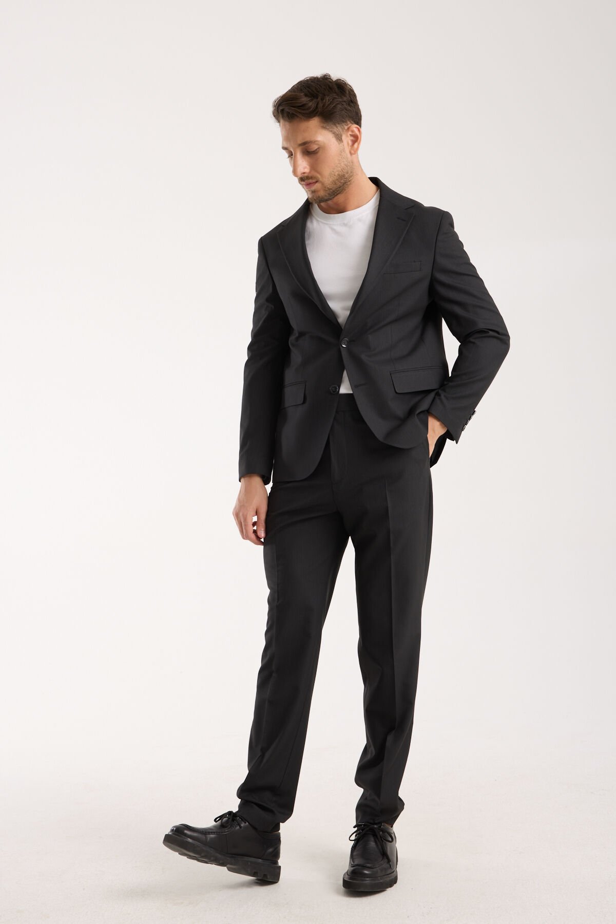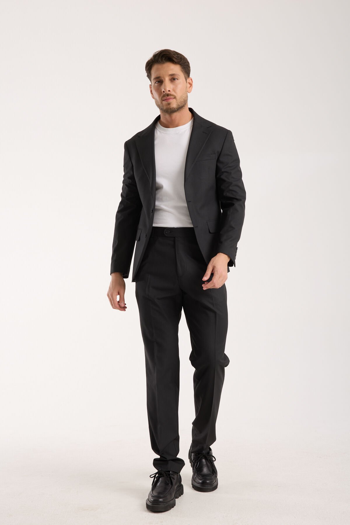 Siyah, erkek giyimde güç, ciddiyet ve netlik hissini en hızlı veren tonlardan biridir. Bu nedenle Sofya Takım - Siyah, yalnızca klasik bir takım elbise değil; aynı zamanda güçlü ve rafine bir stil parçasıdır. Siyah zemin üzerindeki çizgili doku, takımın karakterini belirleyen en rafine dokunuşlardan biridir. Çizgi burada gösterişli bir vurgu değil; bakışa derinlik kazandıran ve yüzeyi daha zengin gösteren bir dokusal katman gibi çalışır. Bu sayede Sofya Takım - Siyah, ışık altında tek düz ton gibi görünmez; kumaşın kalitesini daha görünür kılar ve premium algıyı doğal biçimde yükseltir.