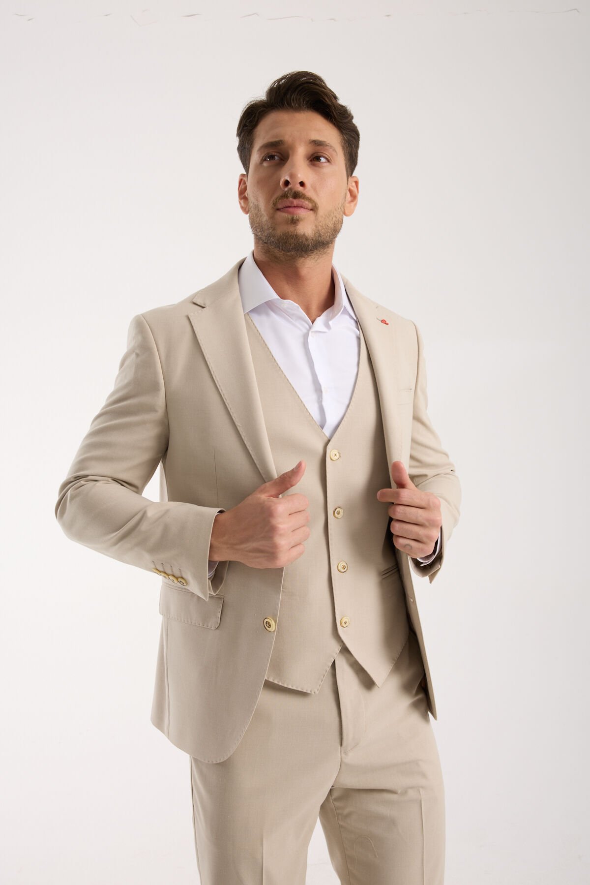 3’lü Takım Elbise - Bej; açık tonlu gömleklerle ferah bir yaz görünümü sunarken, daha koyu aksesuarlarla dengeli bir kontrast yakalanabilir. Yaz davetleri, özel organizasyonlar ve şehir stilinde modern bir duruş arayanlar için ideal bir tercihtir.