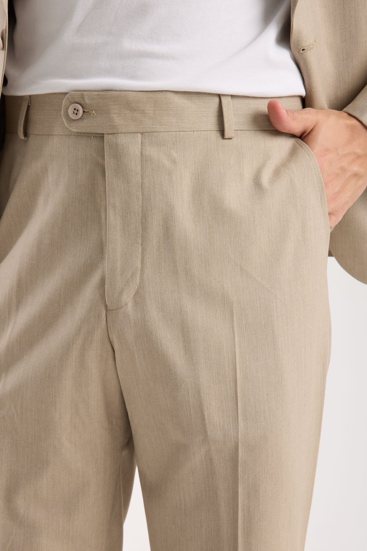 Kumaşın akışkan yapısı ve esneklik katkısı, takımın formunu korurken hareket alanını kısıtlamayan bir kullanım sağlar. Gün içinde uzun süreli oturma-kalkma, toplantı temposu ya da davet boyunca ayakta kalma gibi senaryolarda, takımın üstünde “sert” durması yerine kontrollü şekilde eşlik etmesi hedeflenir. Çizgili yüzey dokusu, bej rengin düz etkisini tek başına bırakmadan daha tok ve karakterli bir görünüm oluşturur; fotoğrafta ve gerçek kullanımda daha net bir duruş verir.