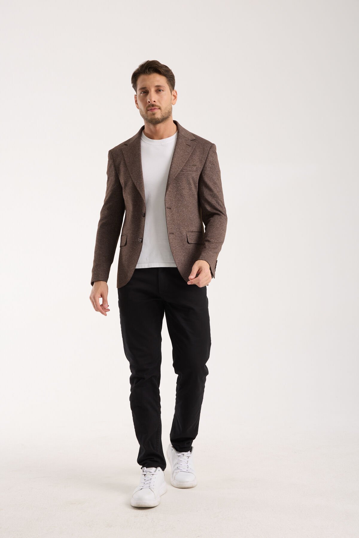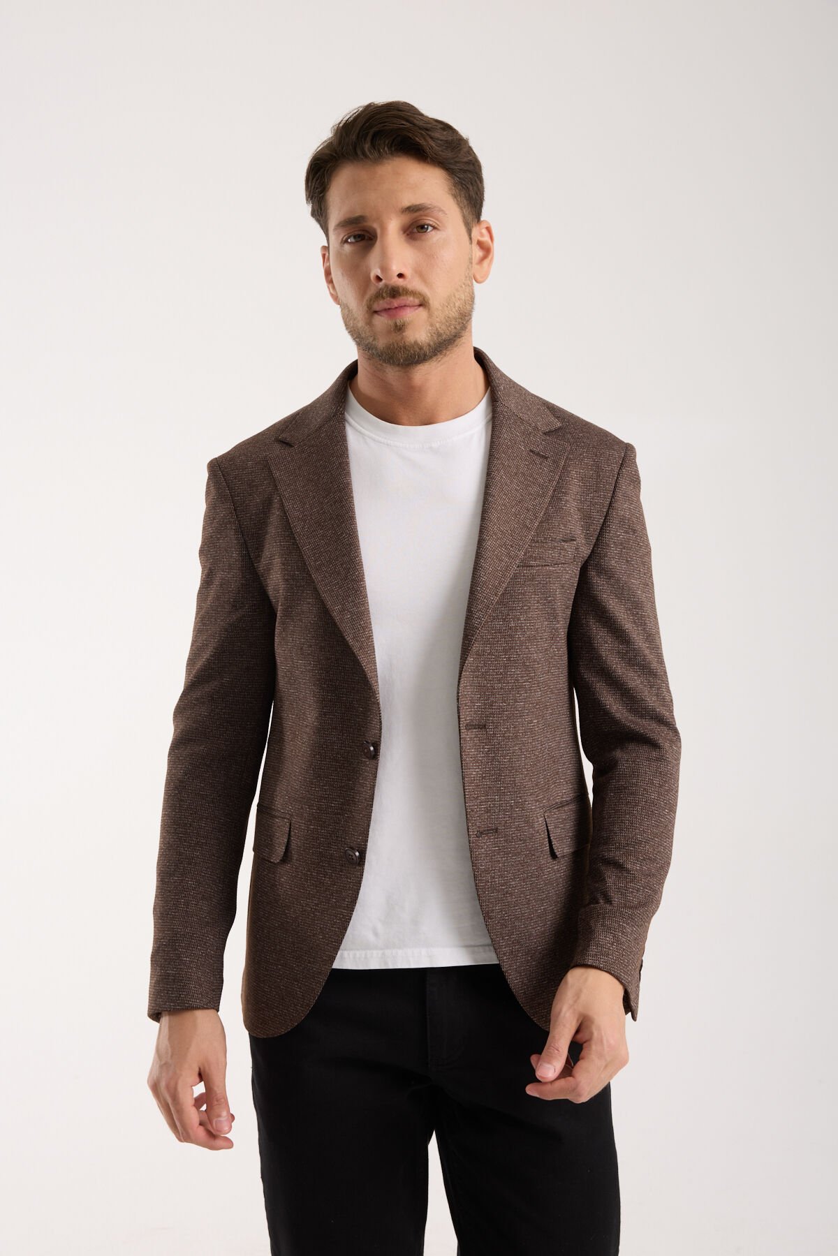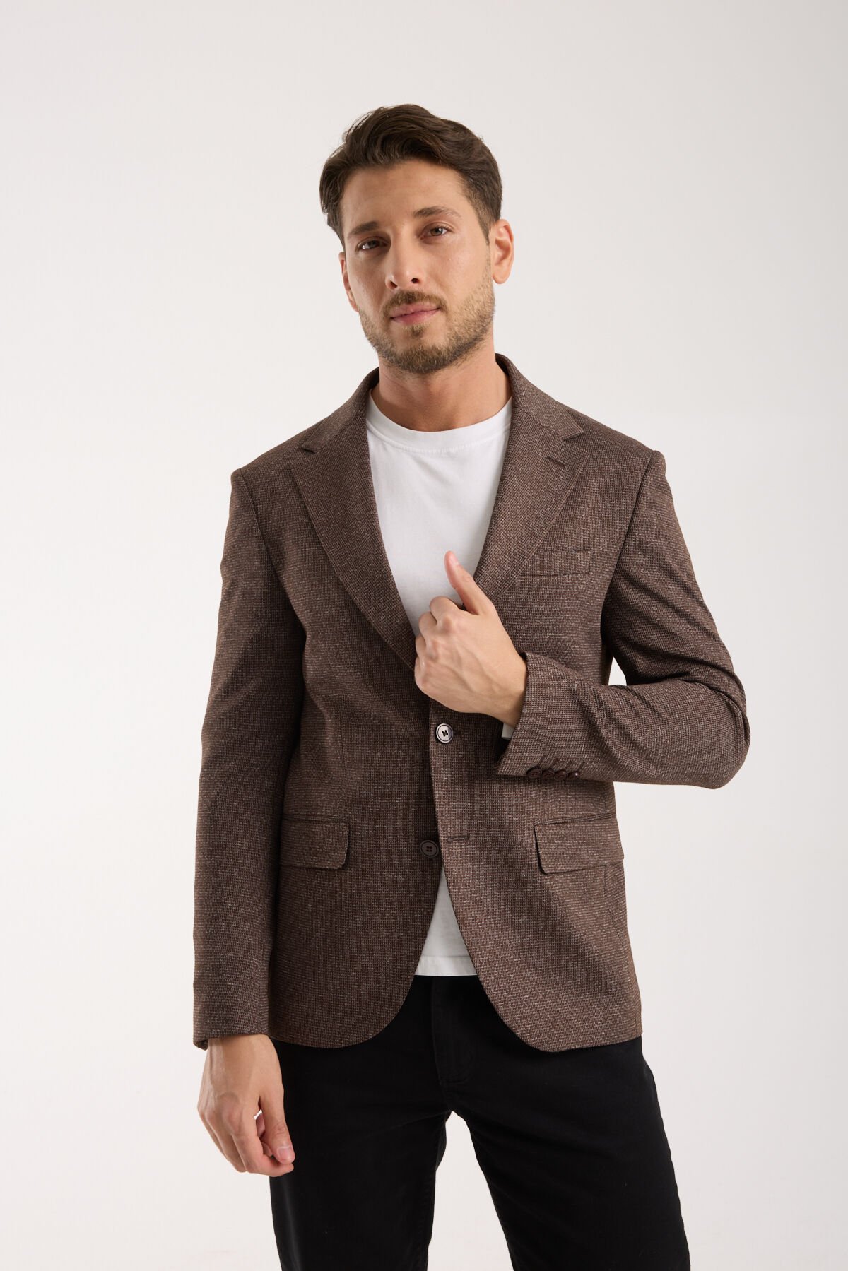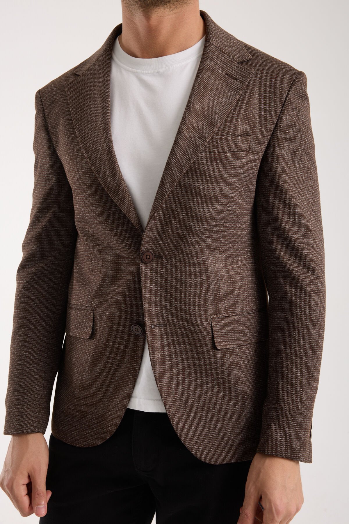 Vega Tek Ceket - Koyu Kahverengi, kahverenginin sıcak ve sofistike karakterini modern tek ceket formuyla buluşturan, bulunduğu ortama derinlik ve rafinelik katan bir erkek ceketidir. Koyu kahverengi ton; siyah ve laciverte güçlü bir alternatif sunar, daha karakterli ve daha şehirli bir stil oluşturur. Bu nedenle Vega Tek Ceket - Koyu Kahverengi, özellikle doğal tonlarla birleştiğinde kumaş dokusunu daha belirgin hale getirir ve premium algıyı güçlendirir. İlk bakışta dengeli ve kontrollü bir duruş sunan Vega Tek Ceket - Koyu Kahverengi, yakından bakıldığında yüzey yapısıyla daha seçkin bir stil etkisi yaratır.