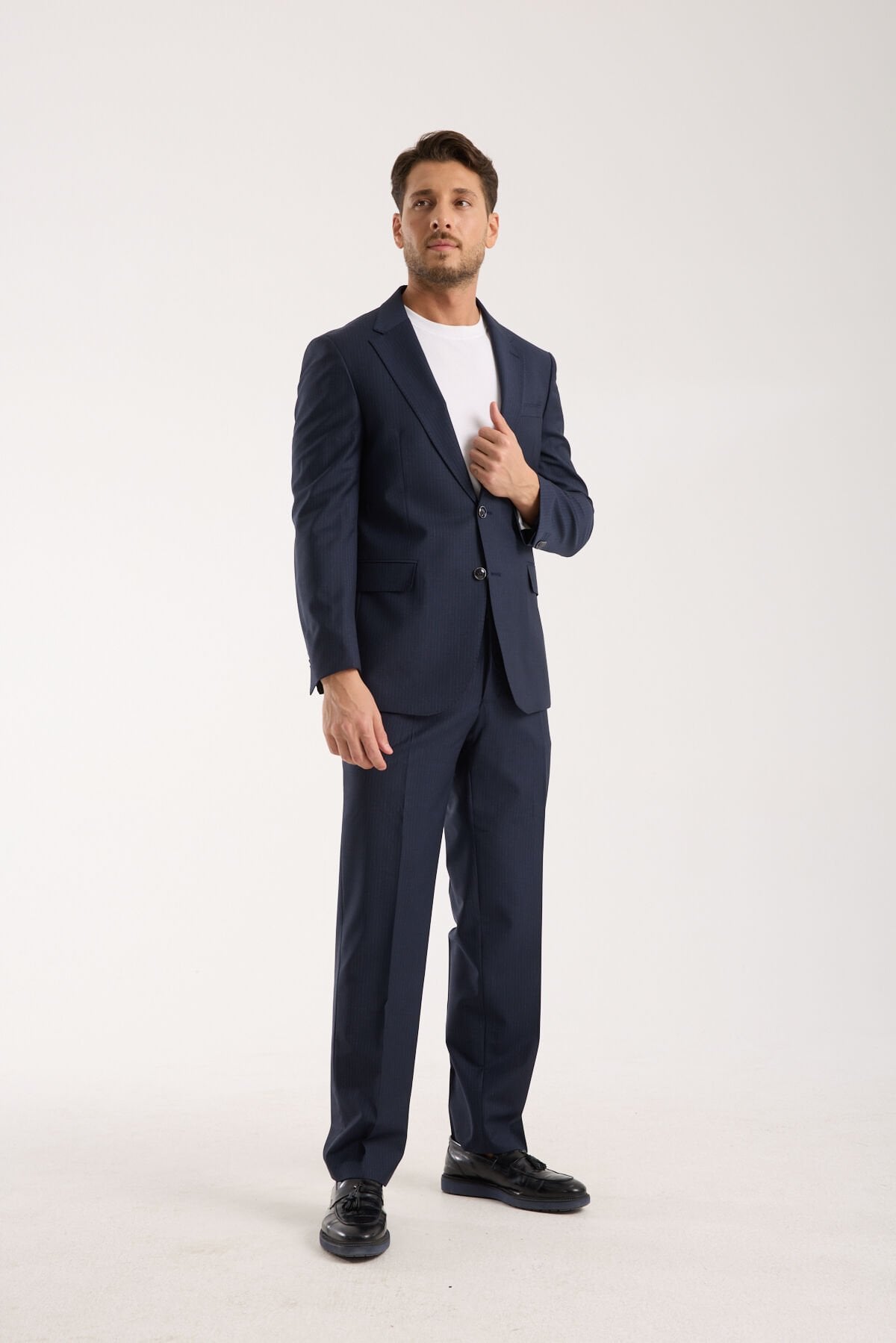 Çizgili lacivert görünüm, lacivertin klasik güvenini bozmadan takıma daha sofistike bir hareket kazandırır. Beyaz gömlekle daha net ve profesyonel bir görünüm kurulabilir, açık mavi tonlarla daha yumuşak ve daha rafine bir geçiş elde edilebilir. İnce çizgili yapı, ürünü düz lacivert takımlardan ayrıştırırken resmi görünüm çizgisini korur. Bu nedenle Yünlü Takım Elbise - Çizgili Lacivert, kurumsal giyimde risksiz ama karakterli bir alternatif arayan kullanıcılar için güçlü bir seçenektir. Etikette yer alan renk ve kod bilgileri de ürün takibini netleştirir.