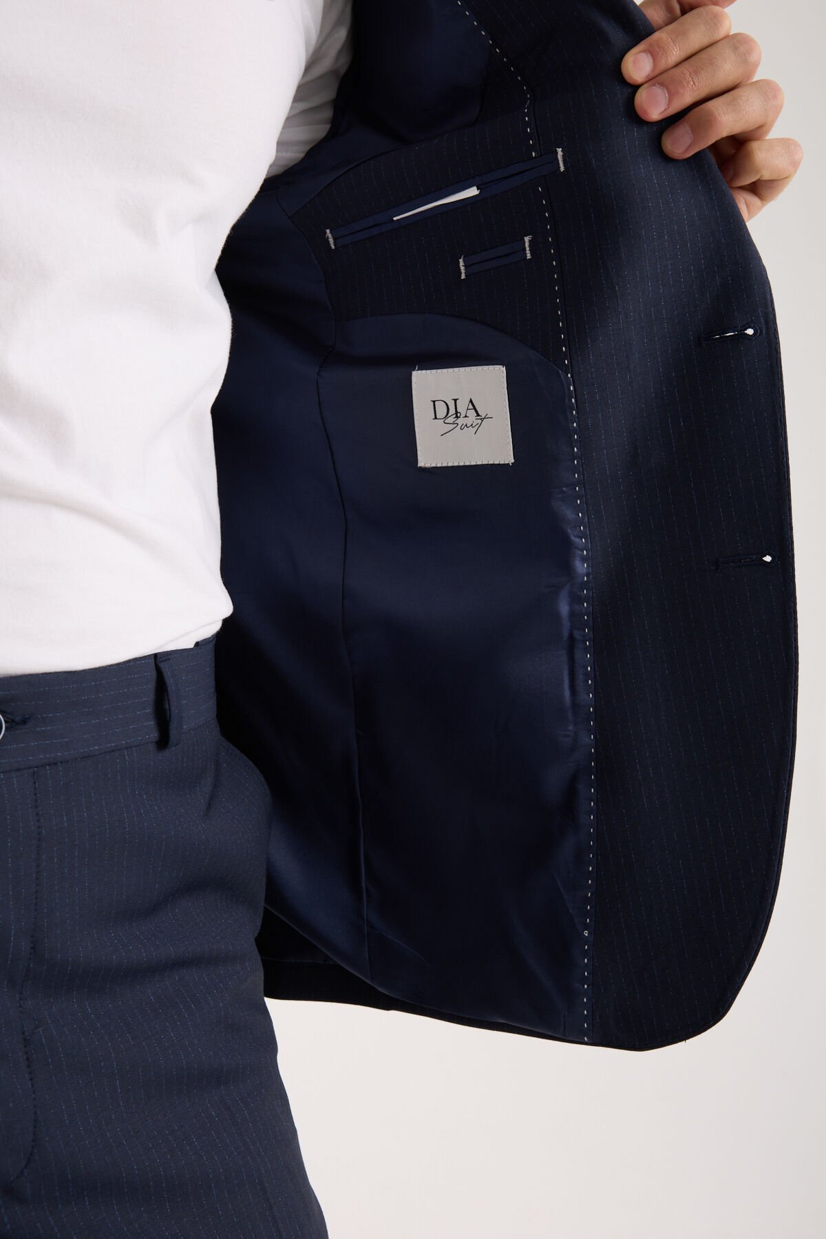 Etikette yer alan CODE: 42 - Kızaklı Pantolon - BRC ibaresi, takımın pantolon formuna dair ürün kodlamasını belirtir. Bu kod, set içindeki alt parça standardını netleştirerek koleksiyon takibini kolaylaştırır. Yünlü Takım Elbise - Çizgili Lacivert modelinde bu detay, ürün bütünlüğünü destekleyen teknik bir avantaj olarak öne çıkar.
